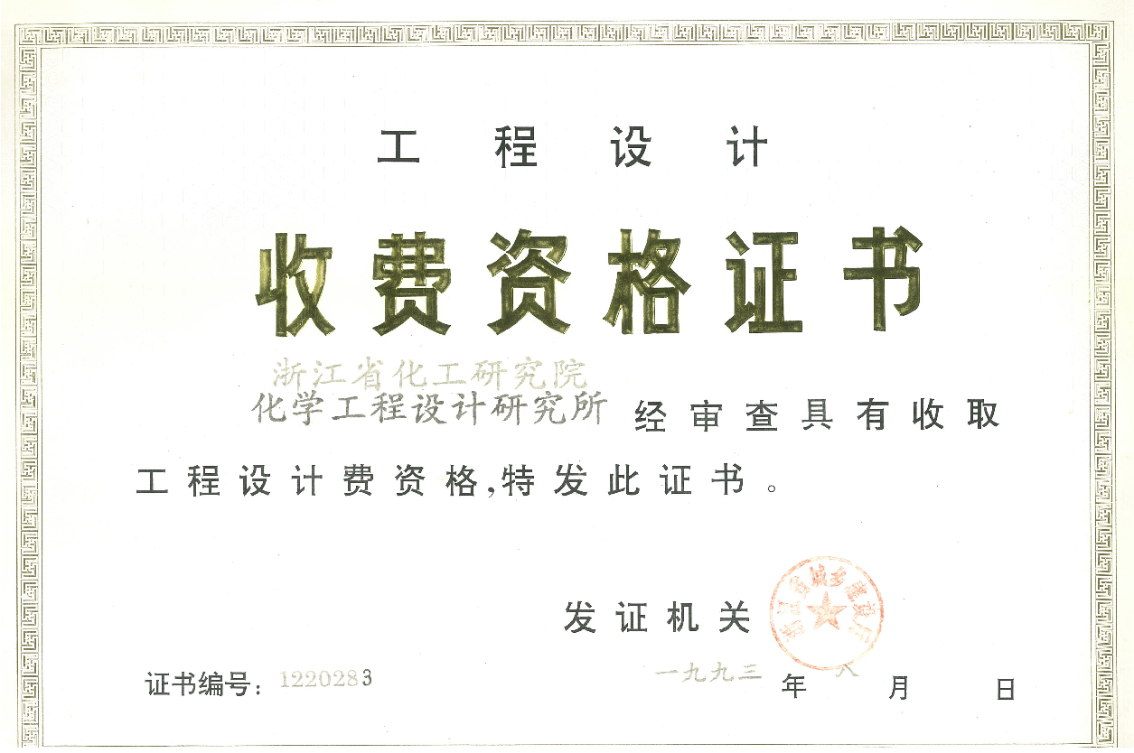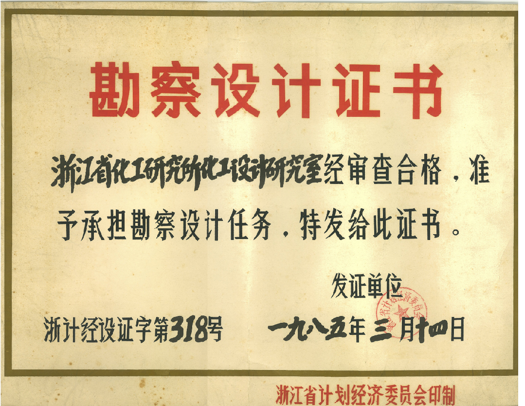 浙江省计划经济委员会颁发的勘察设计证书